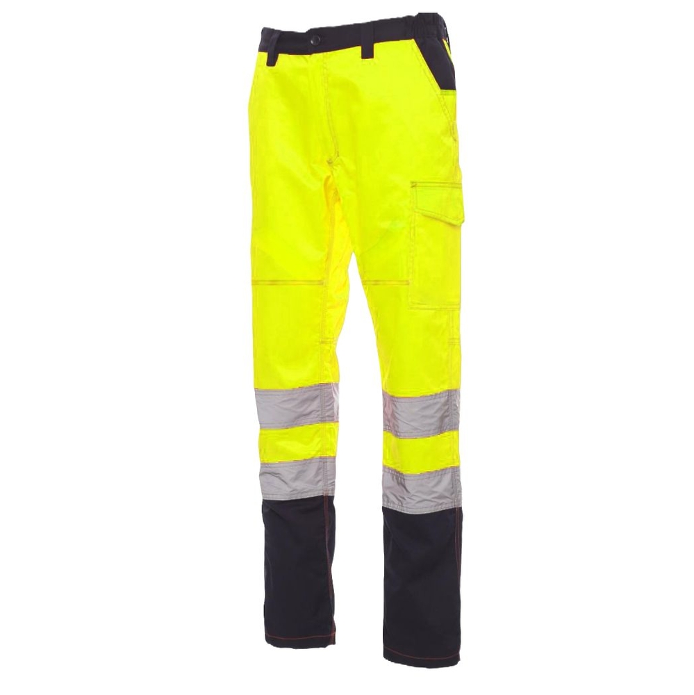 Παντελόνι υψηλής ορατότητας, δίχρωμο με ανακλαστικές ρίγες, πλαϊνό λάστιχο και θηλιές ζώνης στη μέση, σχεδιασμένο για άνεση, ανθεκτικότητα και ασφάλεια όλο το χρόνο. Κλείσιμο με φερμουάρ και πλαστικό κουμπί, δύο κλασικές μπροστινές τσέπες, μία πλαϊνή τσέπη με καπάκι, μία τσέπη για μέτρο, δύο πίσω τσέπες, μία ανοιχτή και μία με καπάκι και Velcro. Σύνθεση: 50% βαμβάκι, 50% πολυεστέρας. Μεγέθη XS-5XL. Διατίθεται σε χρώματα: Φωσφορίζον κίτρινο, Φωσφορίζον πορτοκαλί.