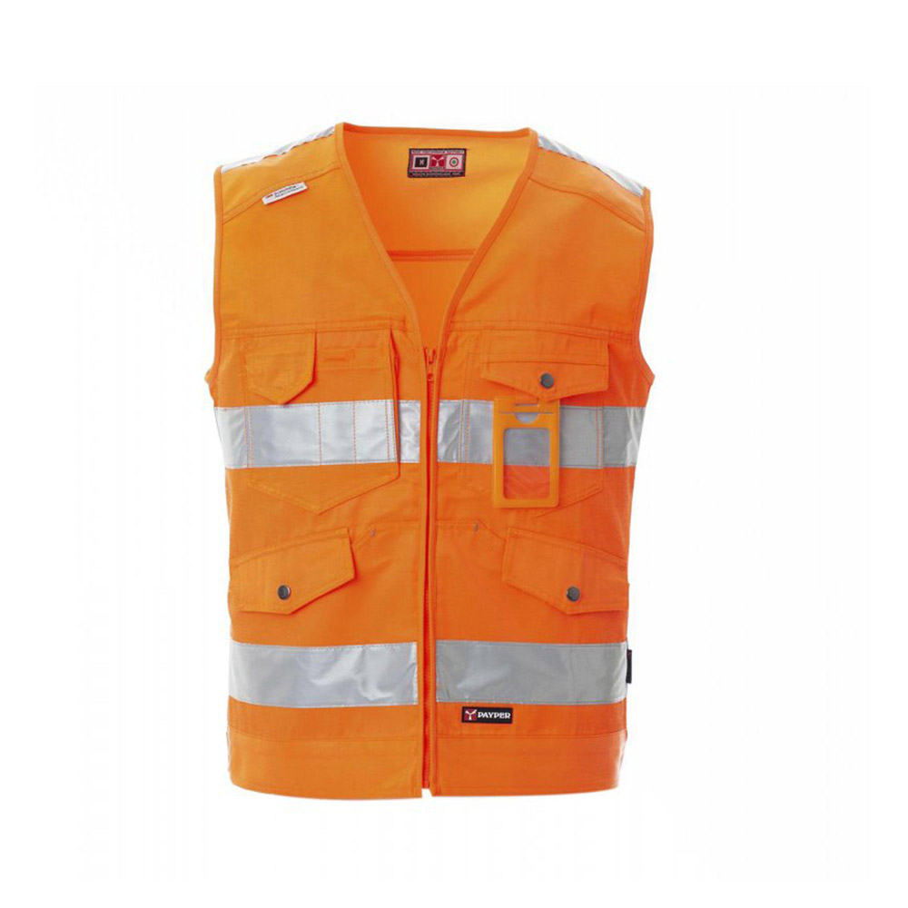 Γιλέκο τύπου τζιν υψηλής ορατότητας με ανακλαστικές ταινίες 3Μ και μπροστινό κλείσιμο με φερμουάρ. Δυο μπροστινές τσέπες μάρσιπο με καπάκι και μεταλλικό κουμπί και δυο τσέπες στο στήθος εκ των οποίων η μια με καπάκι και αποσπώμενη θήκη για κάρτα και η άλλη με θήκη για κινητό. Σύνθεση από 60% βαμβάκι και 40% πολυεστέρα.