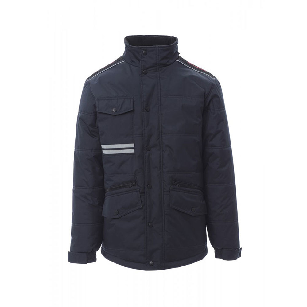Ανδρικό μπουφάν μήκους 3/4, πλαστικό φερμουάρ 8 mm, κλείσιμο με καπάκι και πλαστικά κουμπιά, καμπυλωτή πλάτη και αναδιπλούμενη κουκούλα στον γιακά, δυο εξωτερικές τσέπες με σύστημα κλειδώματος, δυο τσέπες με φερμουάρ, τσέπες με κλίση για ευκολότερη πρόσβαση, μια τσέπη στο στήθος με θήκη για κινητό και δαχτυλίδι στήριξης για κάρτες και ανακλαστικές ταινίες στην τσέπη και στην πλάτη. Εσωτερικό: μαξιλαροειδής επένδυση με fleece, με αντίθεση, στο πίσω μέρος και στον γιακά, μια τσέπη και εσωτερικό φερμουάρ για ευκολότερη εκτύπωση και κέντημα. Σύνθεση από 100% πολυεστέρα.