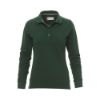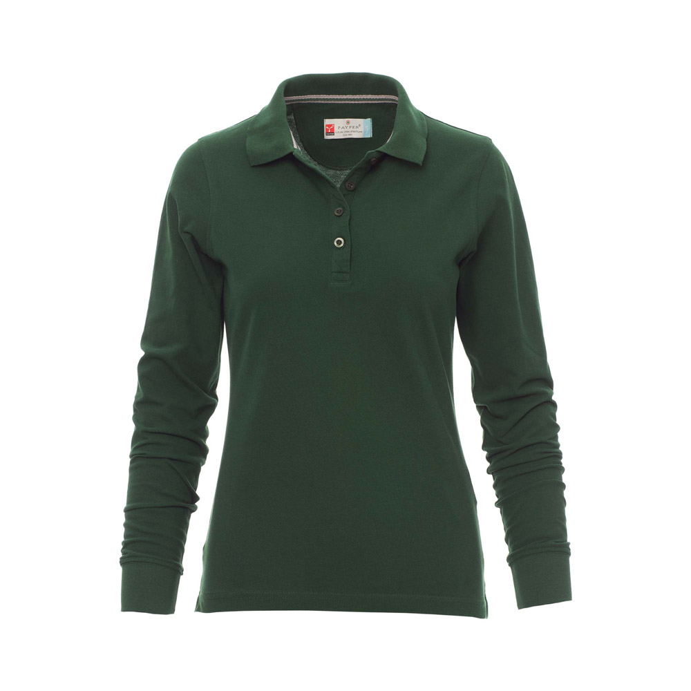 Γυναικείο μακρυμάνικο πόλο μπλουζάκι με τρία περλέ κουμπιά. Γιακάς και μανσέτες με rib, πλευρικές σχισμές, κρυφή ραφή με χρωματική αντίθεση στον γιακά, ελαστικές ραφές, πλαϊνή ενισχυτική ταινία και ταινία στο εσωτερικό του λαιμού. Σύνθεση από 100% βαμβάκι.
